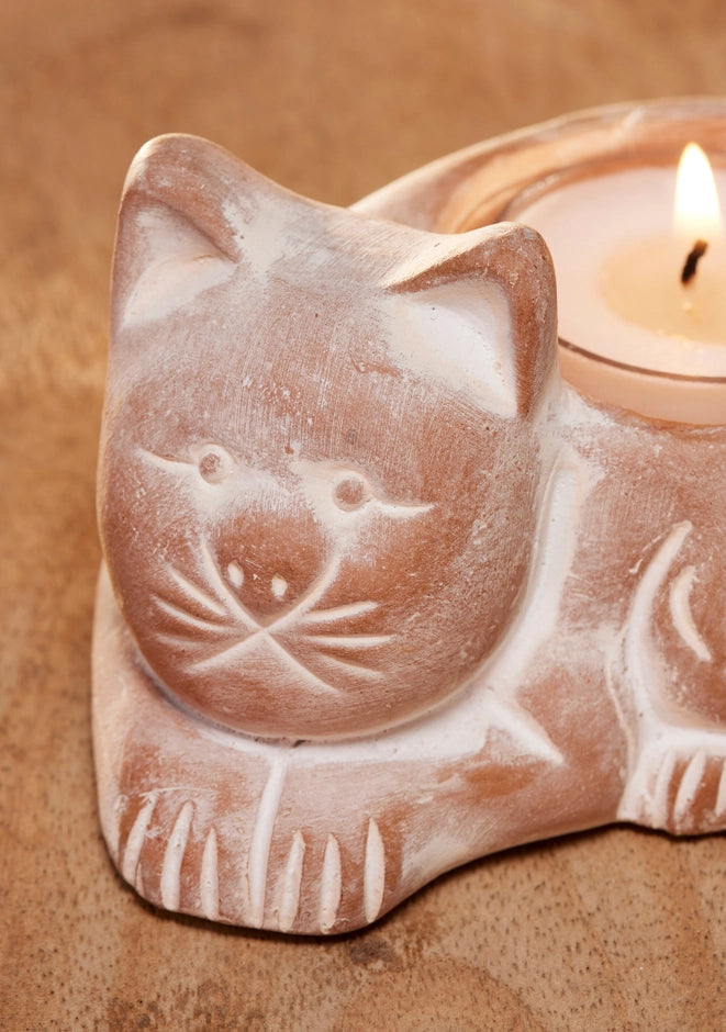 The 'purrfect' gift for a cat lover, this cute terracotta cat tealight holder is made from natural, chemical free, sustainable clay. The timeless design is an appealing little ornament on its own. Add a lit tealight and use as an intimate table centre, a warm welcoming room decoration or give as a charming gift. Hand Crafted In Bangladesh 9 x 7 x 5.5cm Terracotta