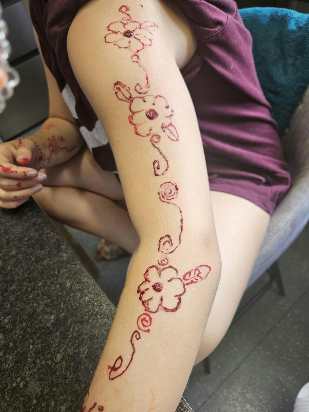 - Cut the tip off the henna cone and gently squeeze it to slowly make body art patterns.