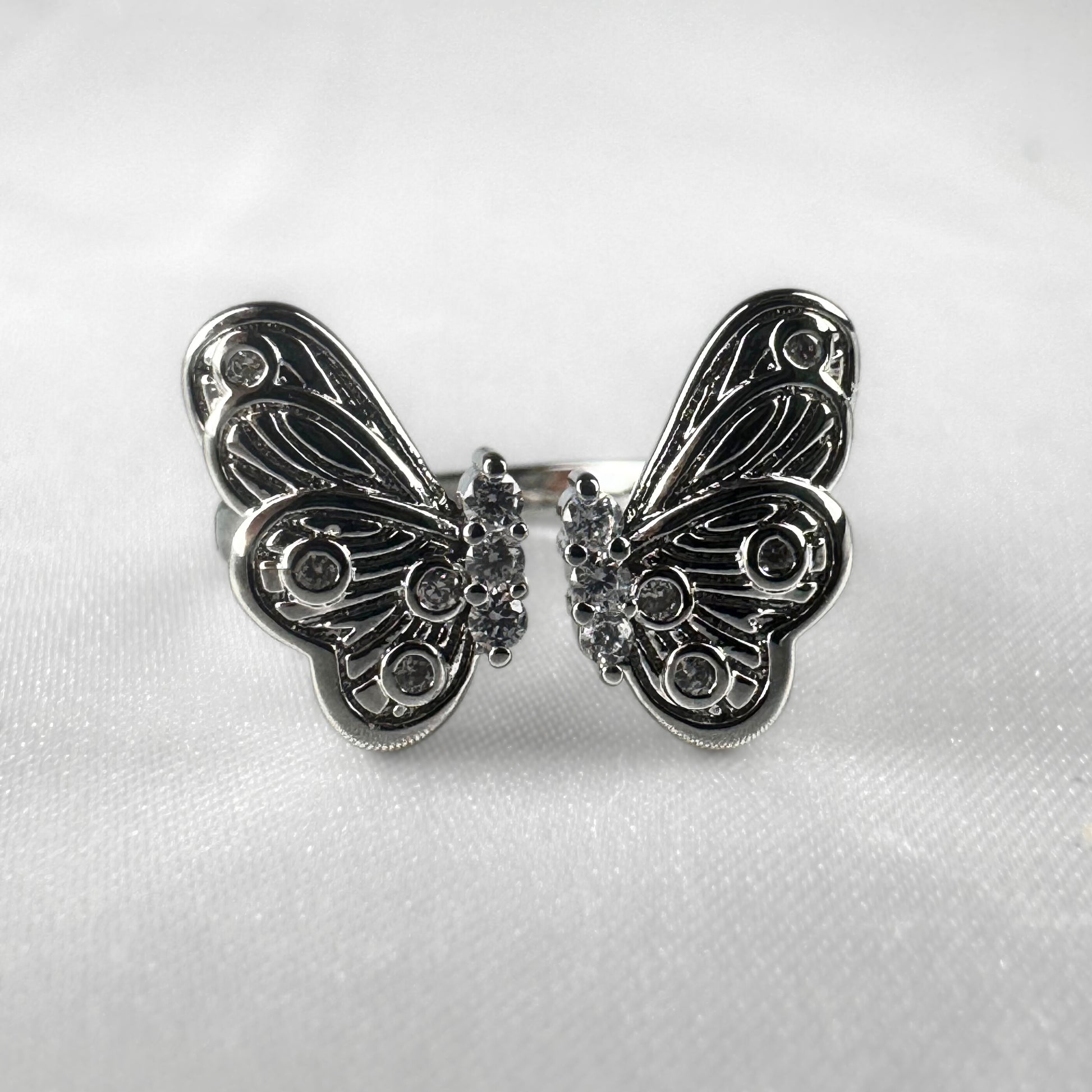 This silver plated butterfly ring features an adjustable band and a large open design. Perfect for adding a touch of elegance to any outfit. Expertly crafted for a secure and comfortable fit.