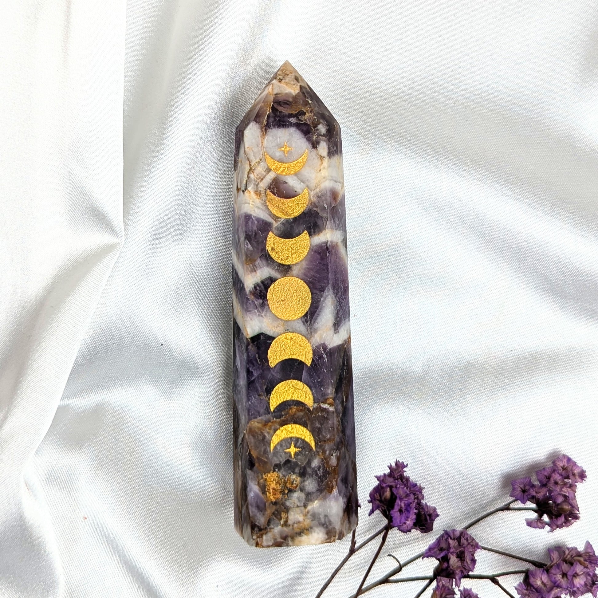 Amethyst Moon Phase Point The amethyst crystal promotes relaxation and stress relief.